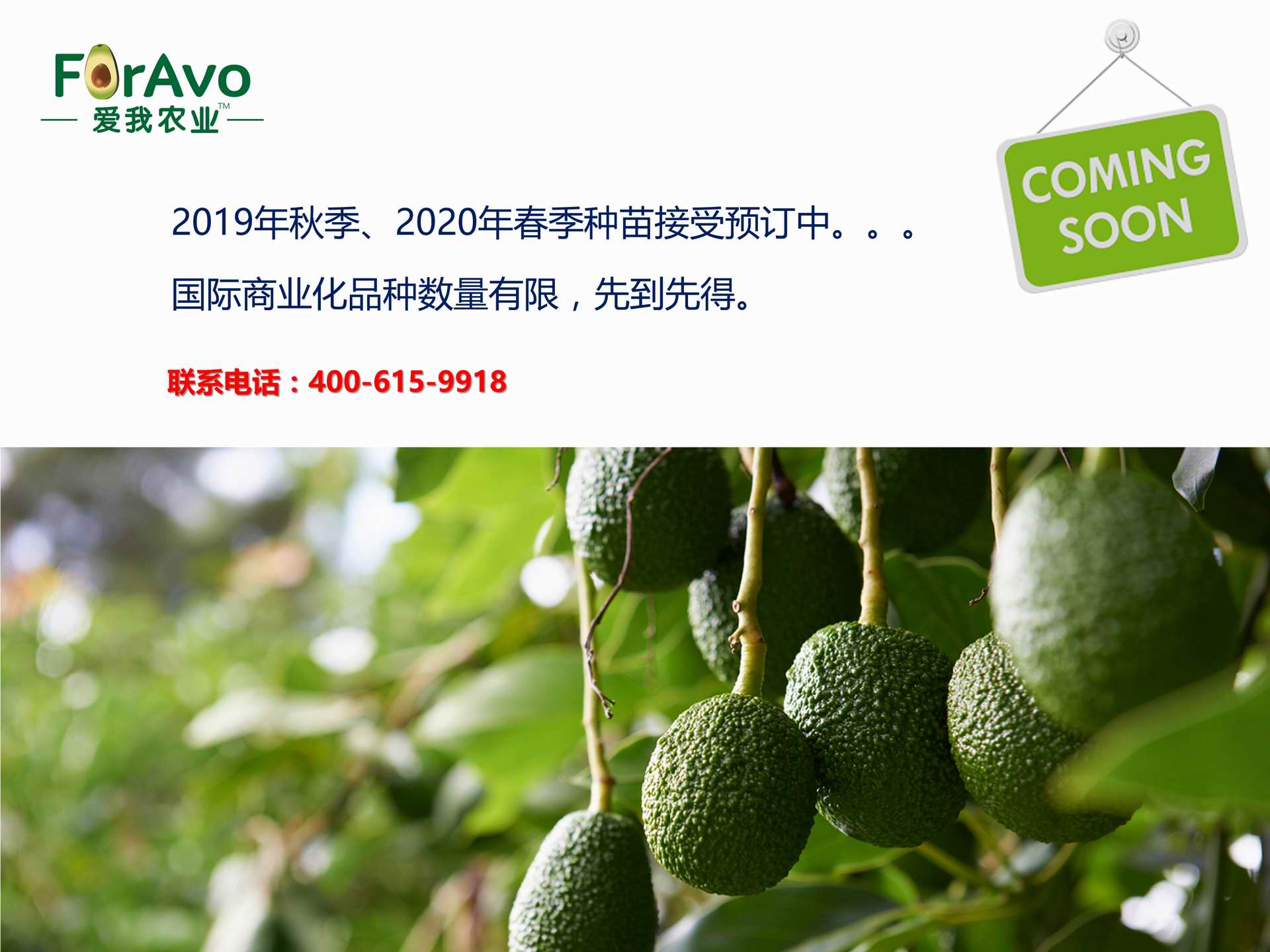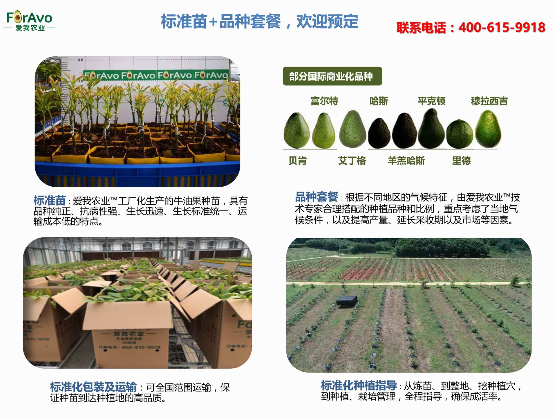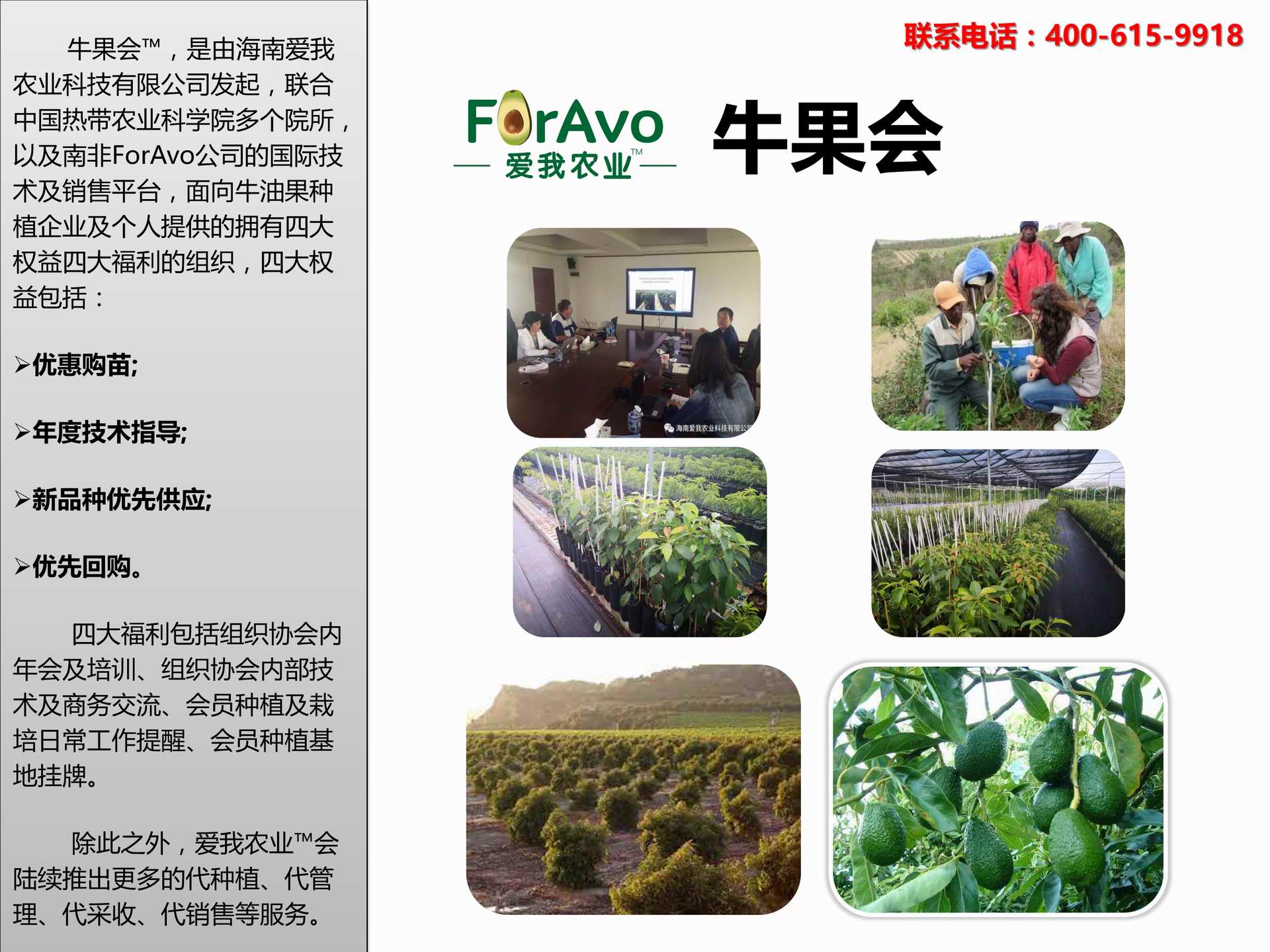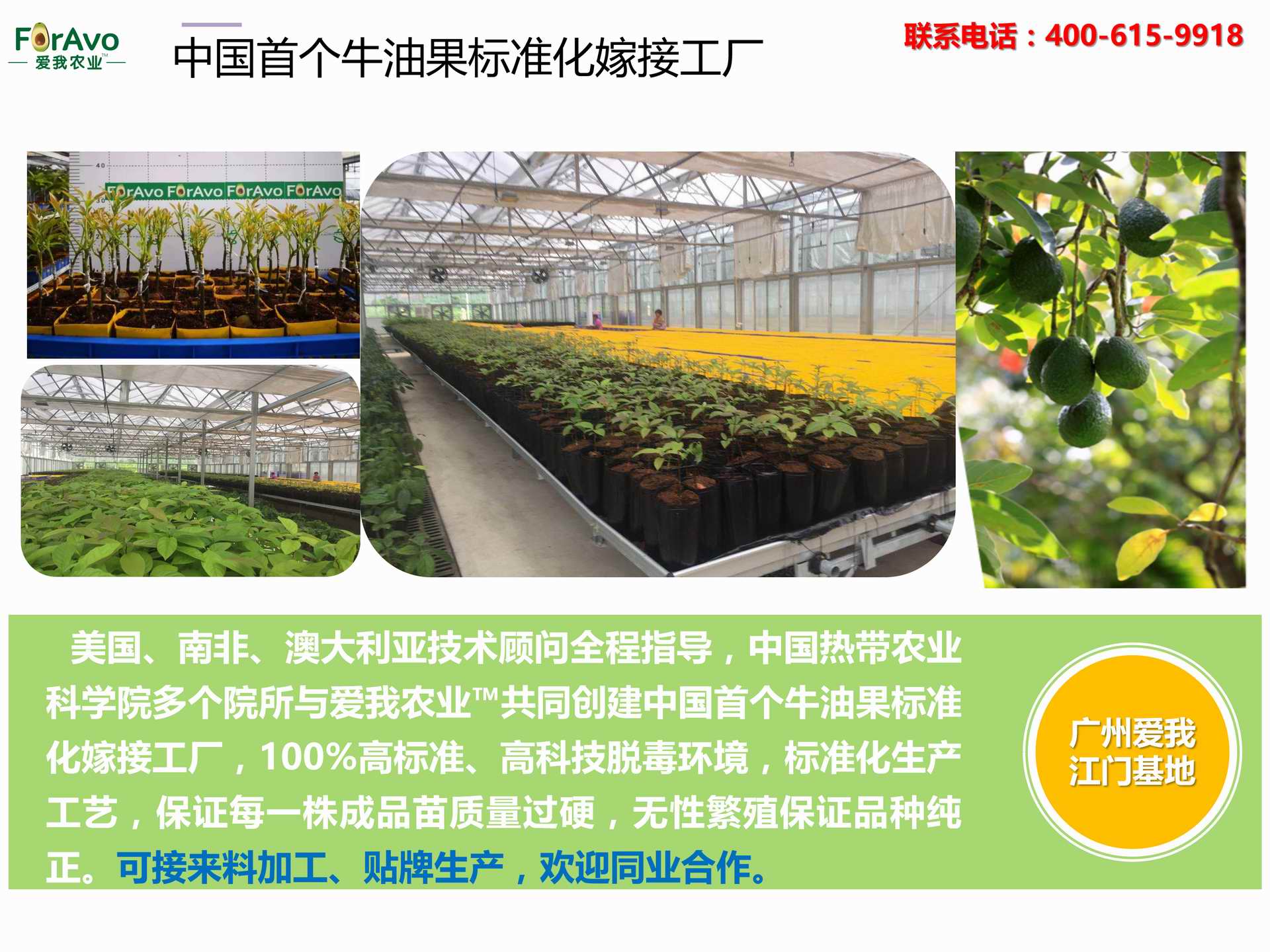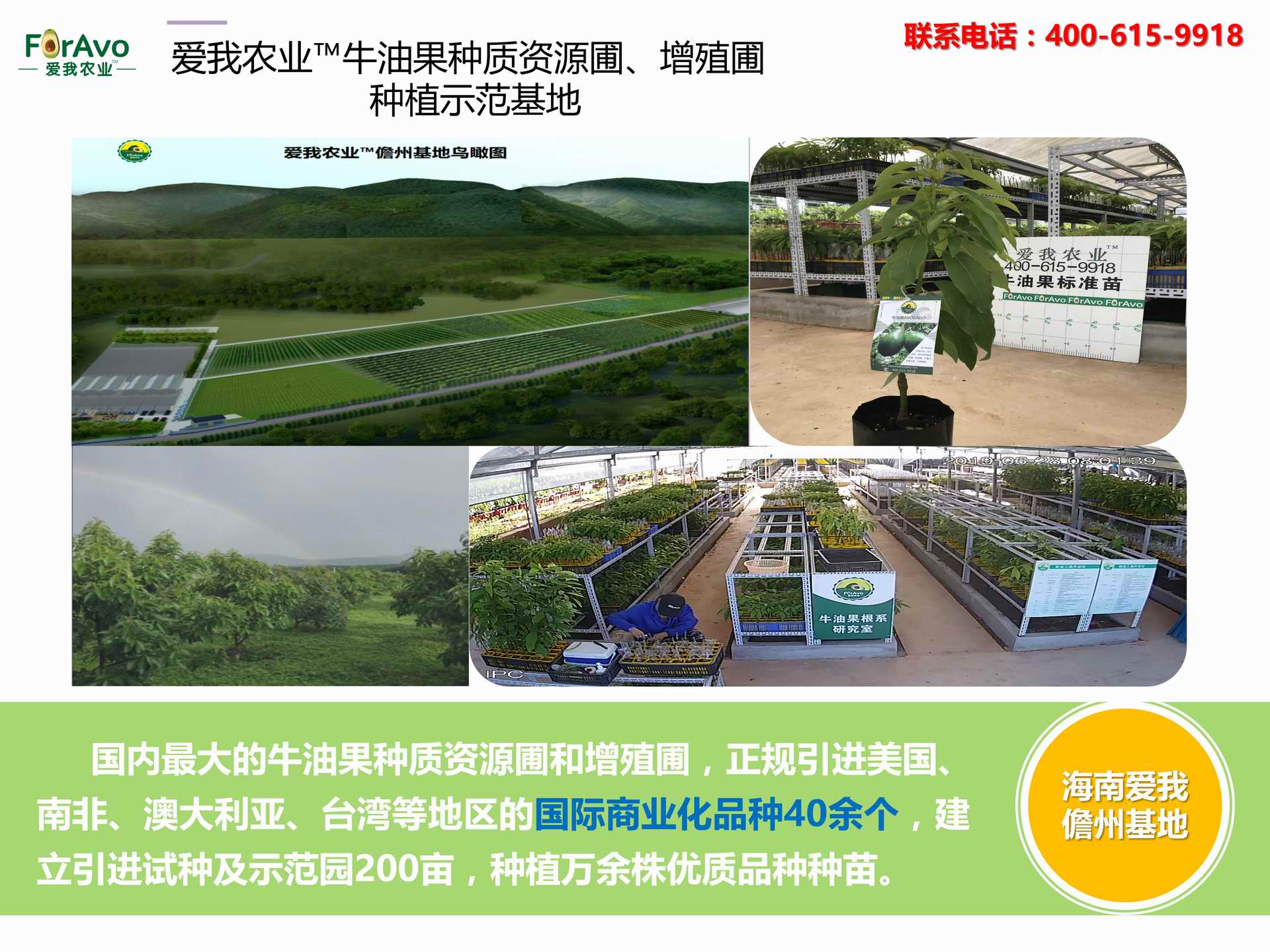 海南愛我農(nóng)業(yè)科技有限公司是一家綜合性的高科技農(nóng)業(yè)發(fā)展企業(yè),旗下愛我農(nóng)業(yè)TM致力于打造中國(guó)最大最強(qiáng)的牛油果種植企業(yè)。依托美國(guó)、南非、澳大利亞等擁有百年牛油果繁育、種植歷史以及產(chǎn)業(yè)鏈?zhǔn)袌?chǎng)的優(yōu)勢(shì),開展牛油果種苗繁育、種植技術(shù),種植加盟、深加工等產(chǎn)業(yè)。結(jié)合中國(guó)市場(chǎng),面向廣大苗圃基地、種植農(nóng)場(chǎng)、合作加工等企業(yè),推出的適合規(guī)模化、標(biāo)準(zhǔn)化的牛油果全產(chǎn)業(yè)鏈服務(wù)。 Hainan Foravo Agricultural Technology Co., Ltd. is a comprehensive high-tech agricultural development enterprise , dedicated to building the largest and most powerful avocado plantation enterprise in China. Relying on the advantage of avocado nursery, planting history, and the industrial chain over 100 years in the United States, South Africa, Australia, we are carrying out nursery, planting, proce...